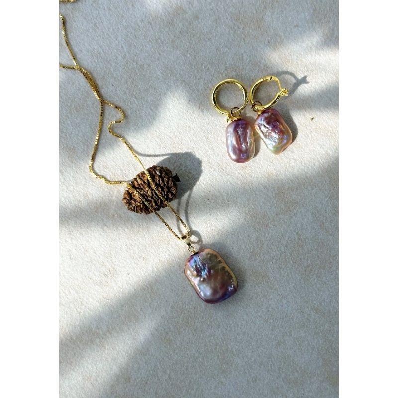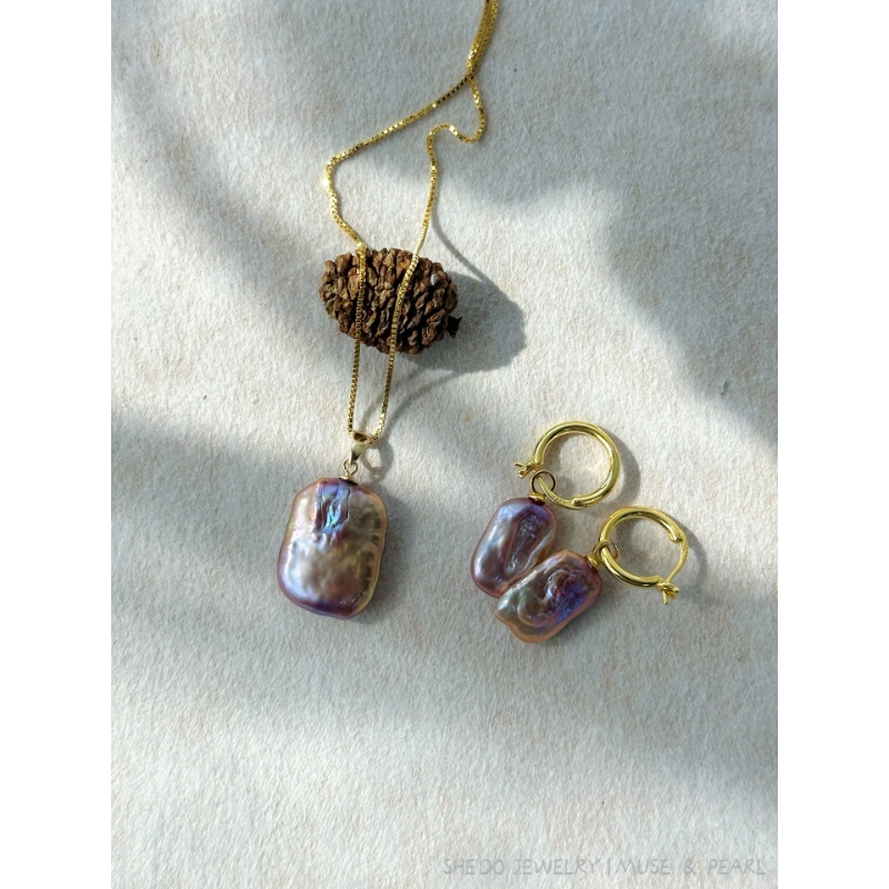 Bold, structural, and undeniably sophisticated. These earrings showcase a pair of matched Square Baroque Pearls, each radiating a multi-dimensional metallic orient that mimics the reflection of city lights. Set against a polished Sterling Silver hoop with an 18K gold finish, the design balances sharp angles with the soft, unpredictable textures of nature. These earrings are the ultimate "Urban Muse" accessory—designed for the woman who navigates the cityscape with confidence and a refined artistic eye.