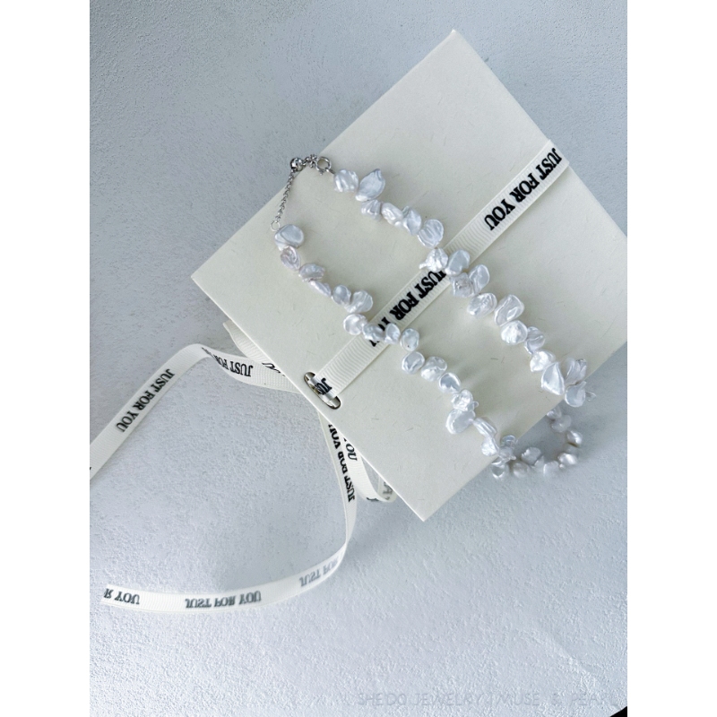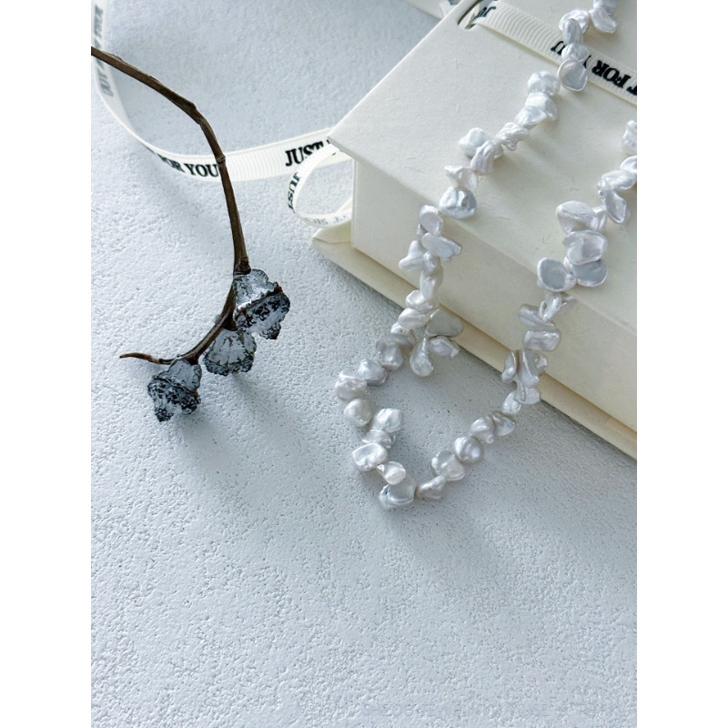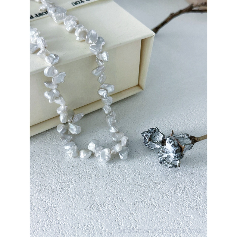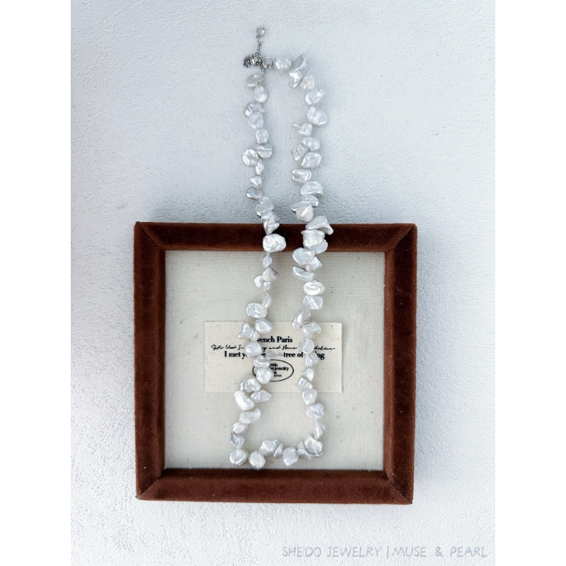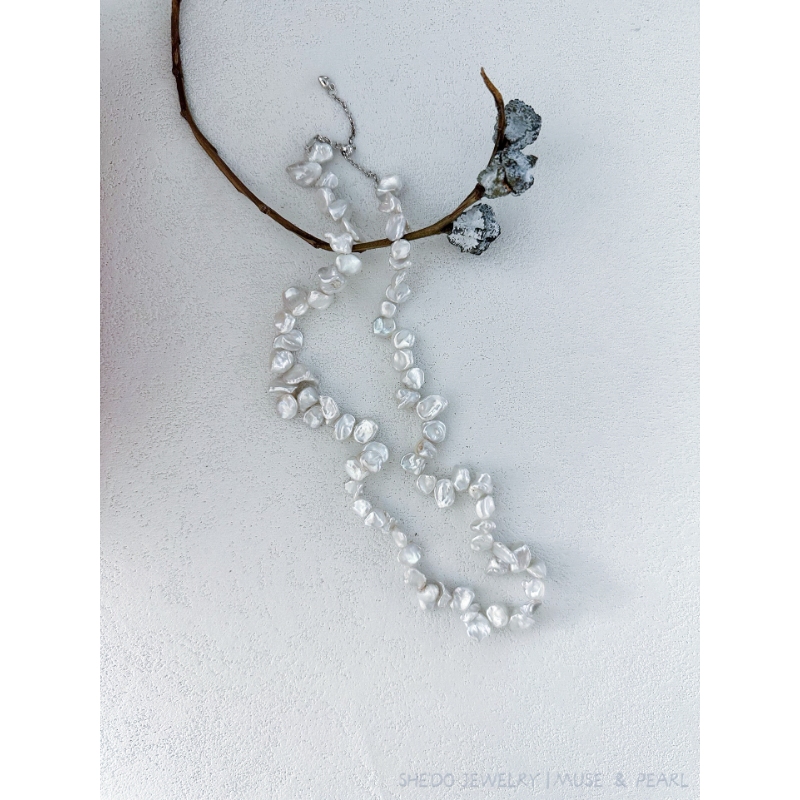 Liquid silver meets organic light. This necklace features a strand of rare, petal-shaped Keshi Pearls, known for their intense luster and absence of a nucleus. Strung on a premium Solid Sterling Silver chain, the cool tone of the metal amplifies the icy white glow of the pearls.